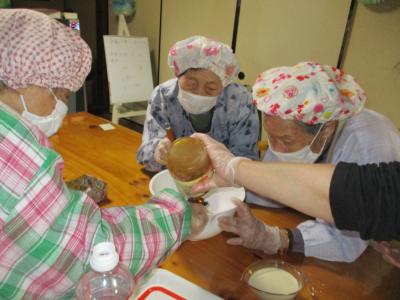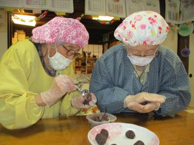 粒あんを手に取り、一つづつ くるくる丸めていく母達