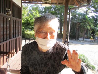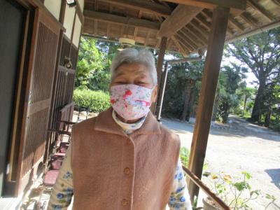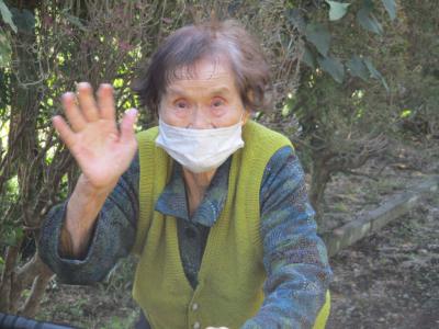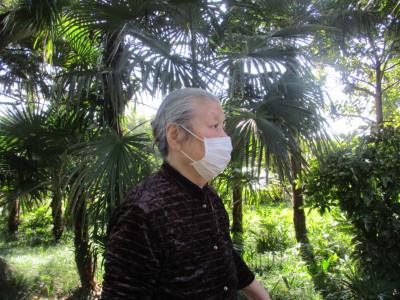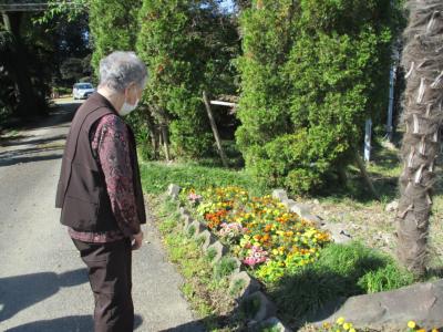 オーナーが植えて下さった花を見つめる母