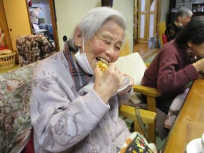 口に入れた瞬間にカメラを向けてしまったので恥ずかしと笑う母