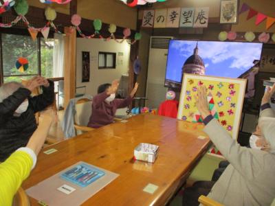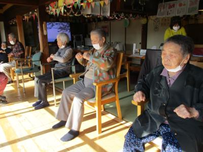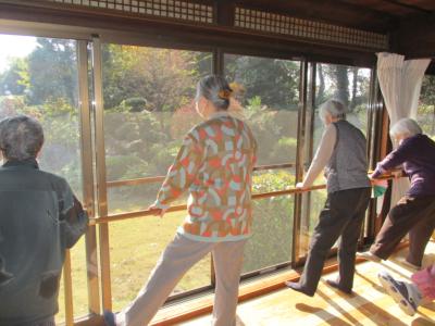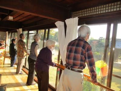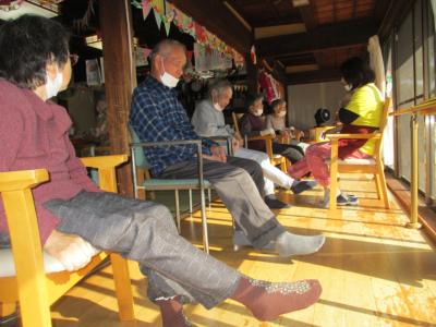柔らかな日差しが差し込む縁側にて、仲間と共に身体を動かす皆さんの姿