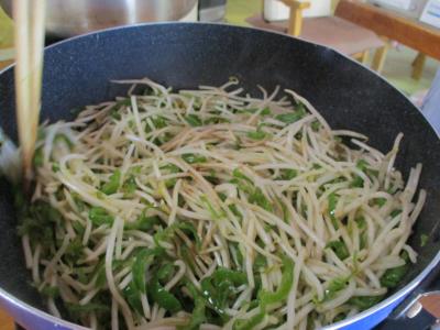 もやしとピーマンのオイスター炒めを作りはじめた母です