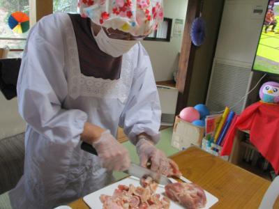 母たちで協力して美味しい昼食作りのスタートですうれしい顔指でOK