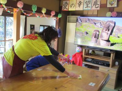 昼食準備まえには、必ずテーブルの消毒を行ないます