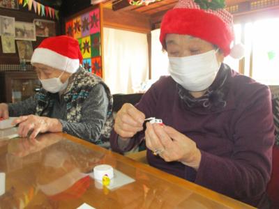 小さなオーナメントを手に、ボンドを塗る作業を進めるお母さん達です。