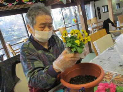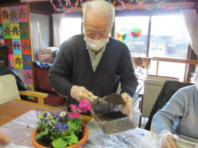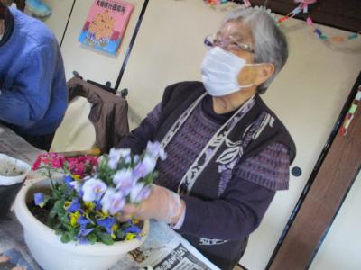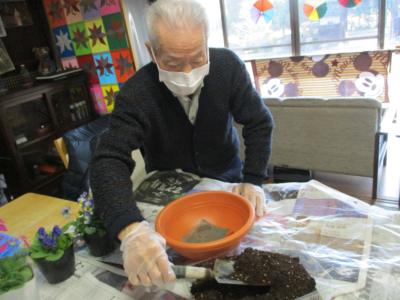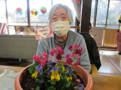 先生は前回の寄せ植えの花を再び綺麗に咲かせている植物名人なんです