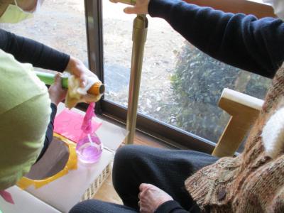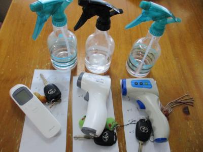 お迎えには体温計と消毒ボトルを持っていき