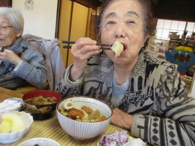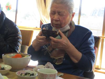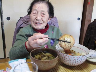 きのこ汁を一口 「うぅーんおいしい!」