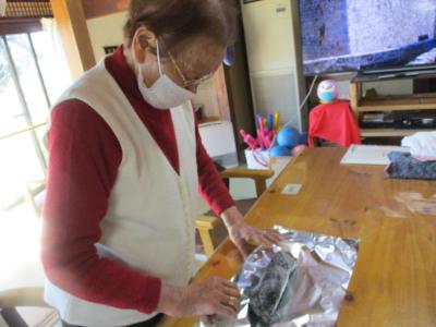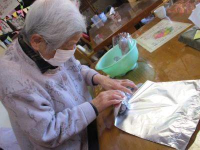 サツマイモを新聞紙で包み、濡らしてからしっかりとアルミホイルで包みます