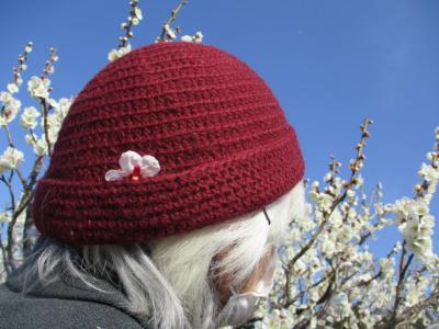 ちょこんと母の帽子についた梅の花