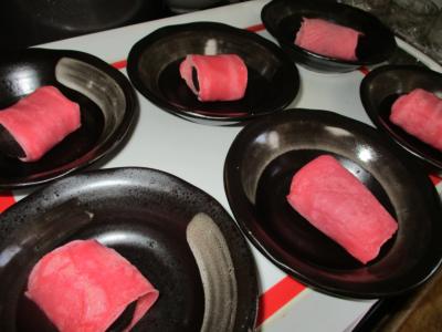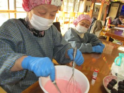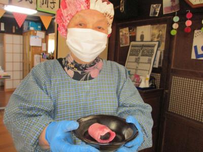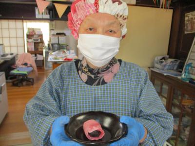 白玉粉と小麦粉を水で溶き 混ぜた生地の中に食紅を入れピンク色に・・・