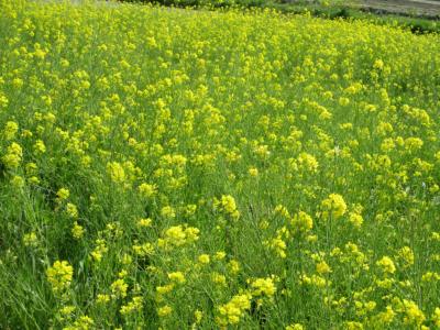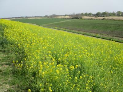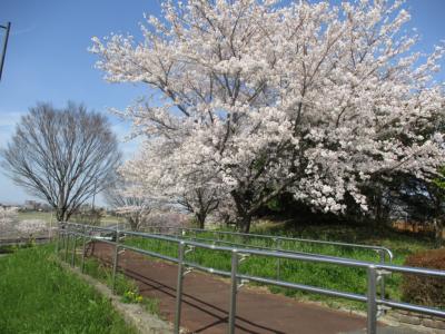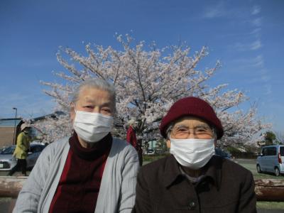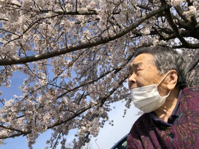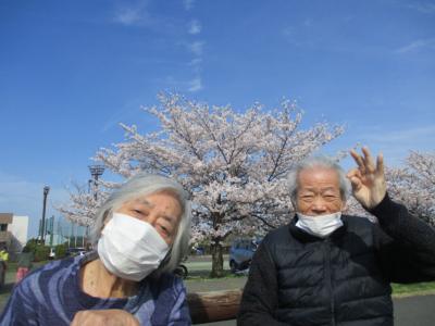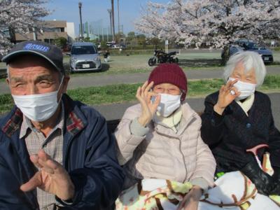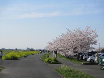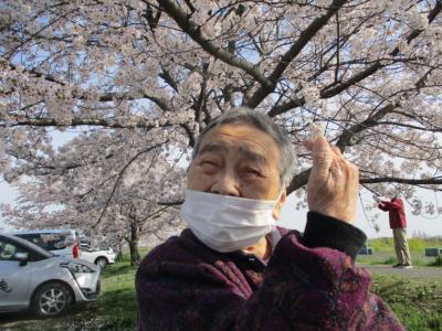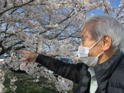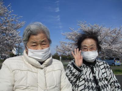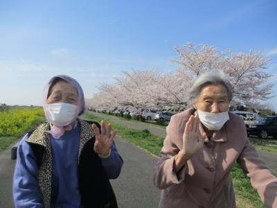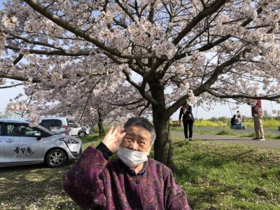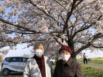ベンチに座り圧巻の桜と土手一面の菜の花を楽しむ父母