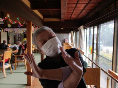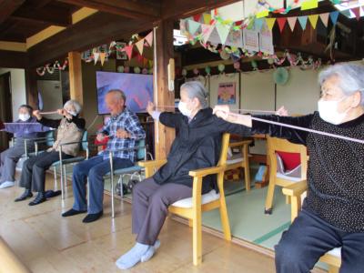 縁側では、仲間と共に熱心に身体を動かす皆さんの姿