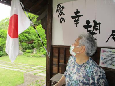 驚いたように振り返り、風に揺れる国旗を眺めるお母さん。