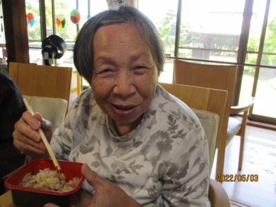 早速ご飯を頬張る父、母うまい! (顔)