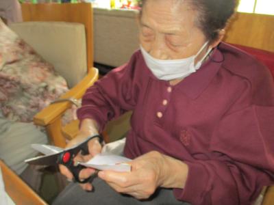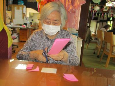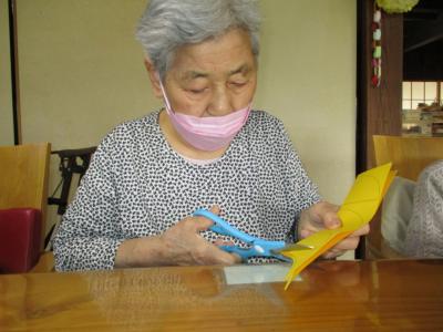 お母さんは、印が付けられた色画用紙を線通りにカットして下さっています