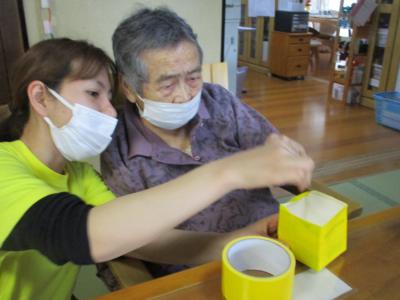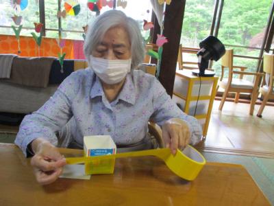 切っていただいた牛乳パックにカラーテープを貼っていきますー (長音記号2)ー (長音記号2)ー (長音記号2)