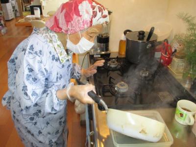 お母さんは、寒天を煮溶かして下さっています