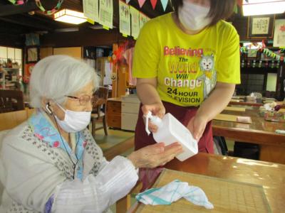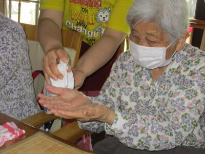 食事前にも、ひとりひとりに手指の消毒を施します。