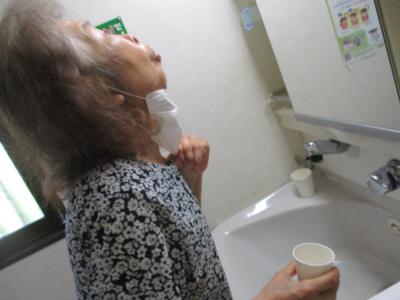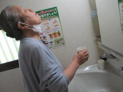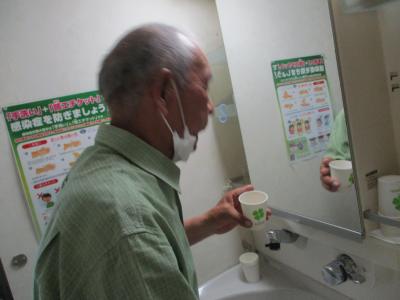 傍にはスタッフが寄り添い、サポートしながら朝の洗面所は和やかムード