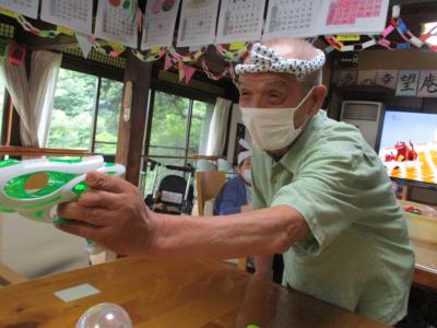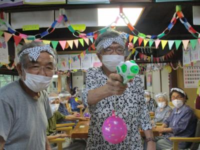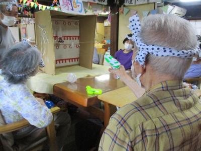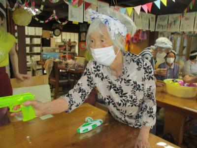 水鉄砲を手に、景品目掛けて闘志を燃やします。