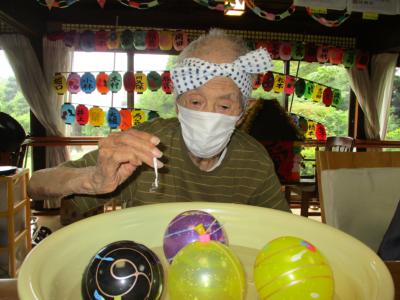目の前のヨーヨーを前に、集中されヨーヨー釣りを楽しまれていました。
