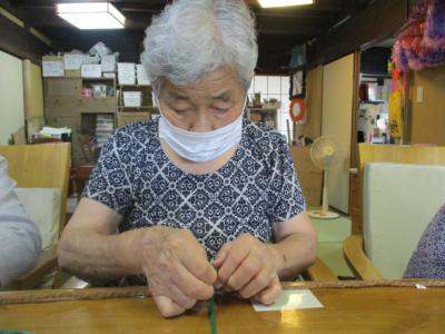 いろんな色の毛糸や麻ひもでネットを作ります