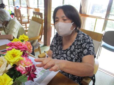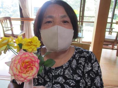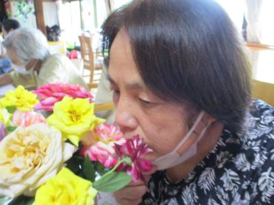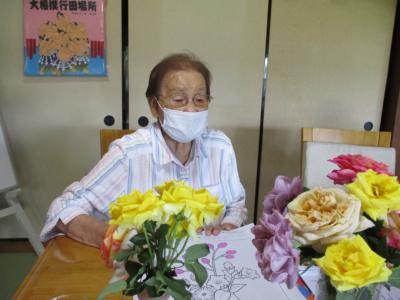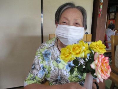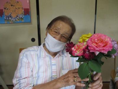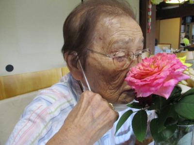 テーブルの上の花瓶の薔薇を見てウットリされる母