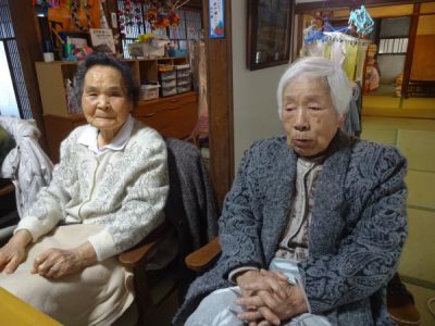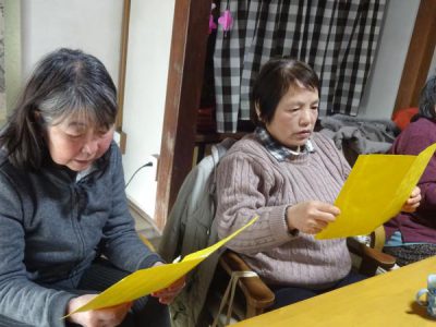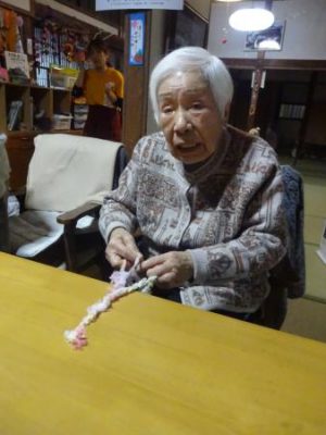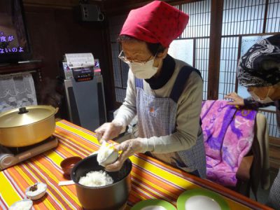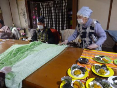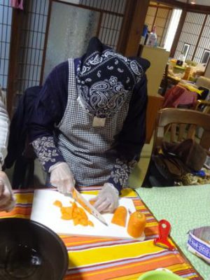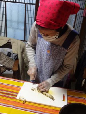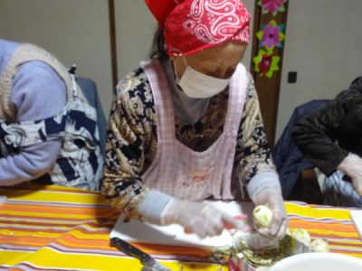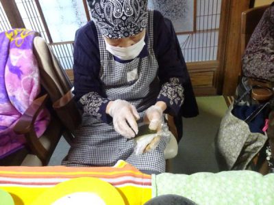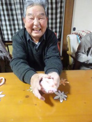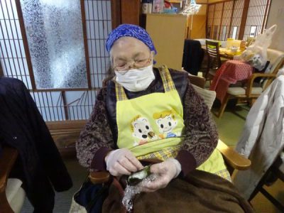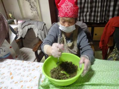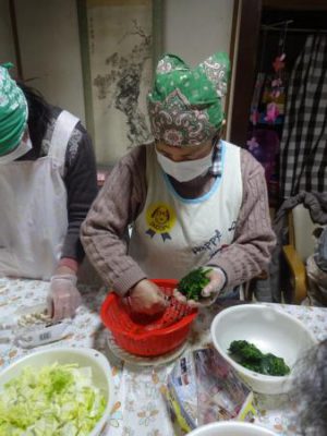 茹でたほうれん草を 父がギュッギュッと絞ります