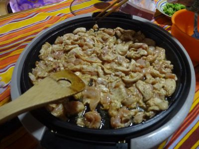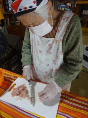 母が丁寧に切ってくれた鶏肉を炒めていきます