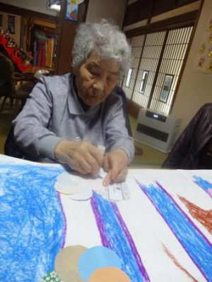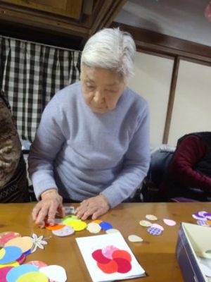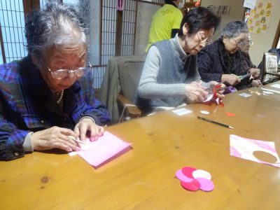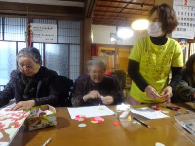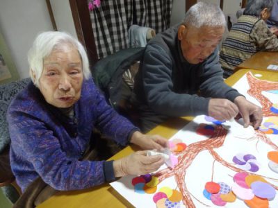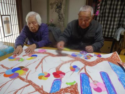 午前中は壁画の梅の花作りです