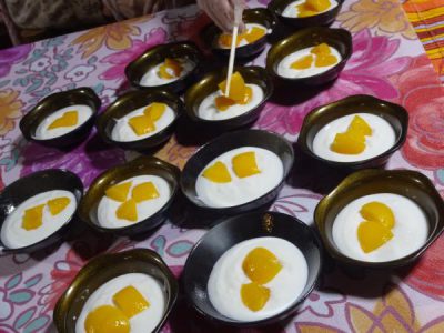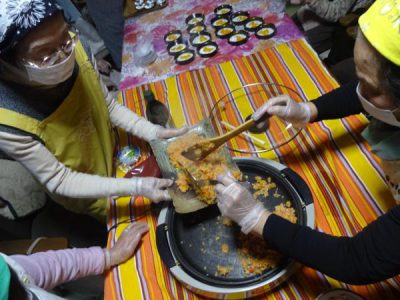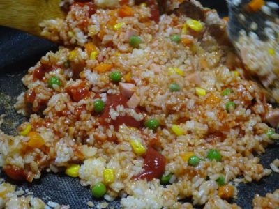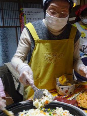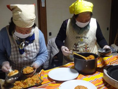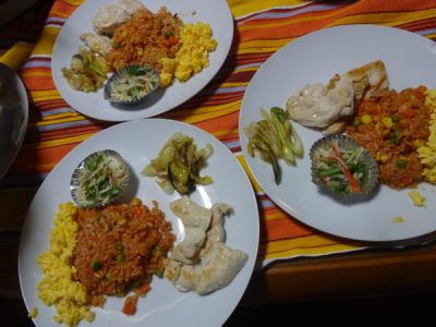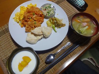 ご飯やサラダ、炒めものをサラダに盛り付け