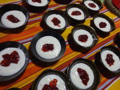 赤い苺ジャムが乗せられ綺麗なヨーグルト