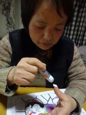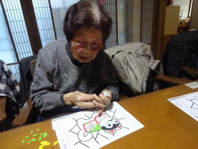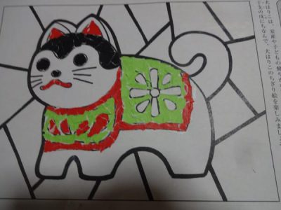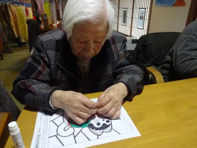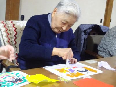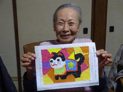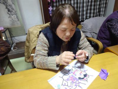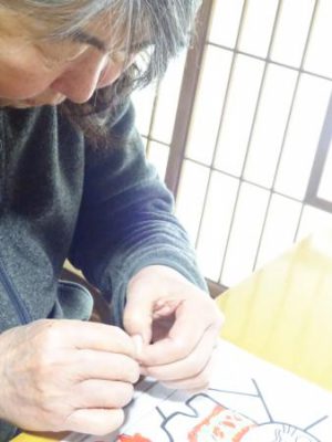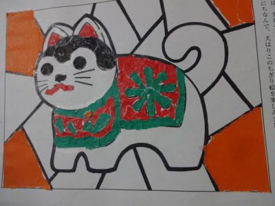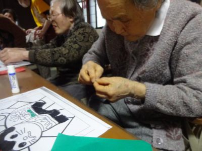 折り紙を細かくちぎり、絵に合わせて貼っていく