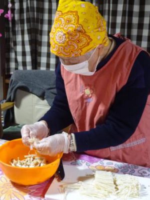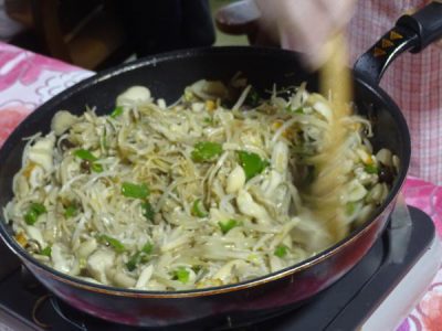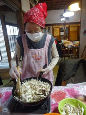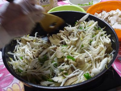 たくさんのキノコ達が母の手で炒められていきます