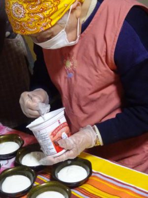 ヨーグルトを混ぜる母・盛り付ける母