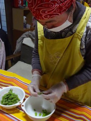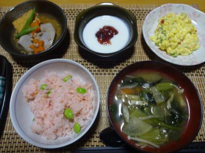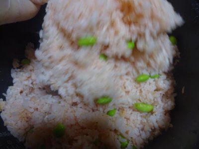 桜えびの入った桃色のご飯には 黄緑色の枝豆が映えます蠍座