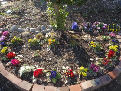 花壇の花たちがお出迎え 母たち元気にご来庵ですわーい (嬉しい顔)ハートたち (複数ハート)