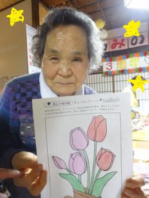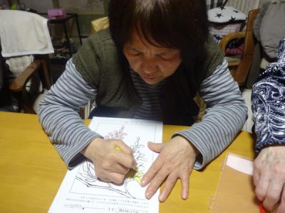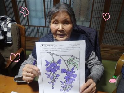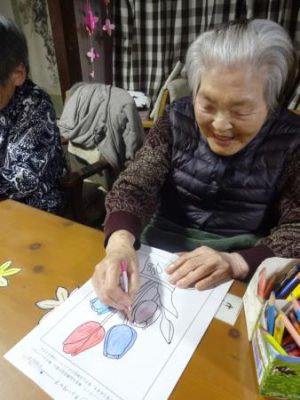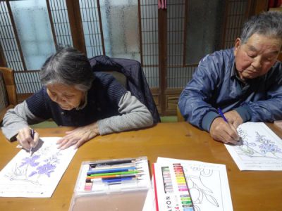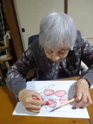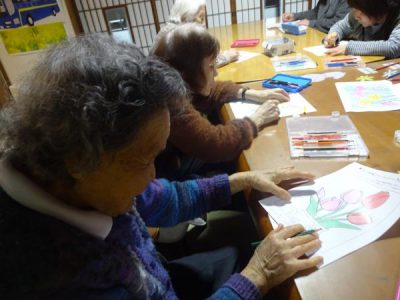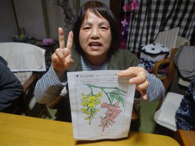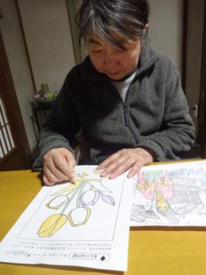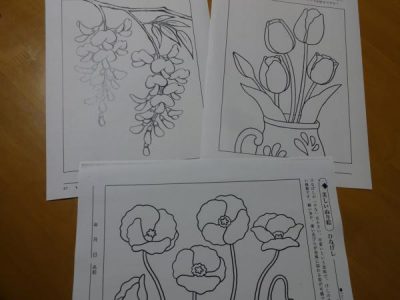 一方 こちらの母たちは 春の花の塗り絵です