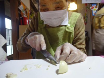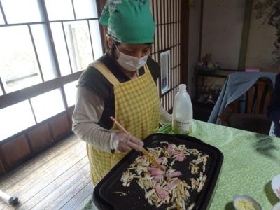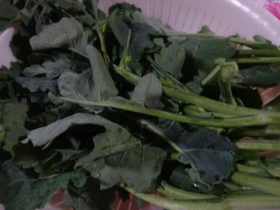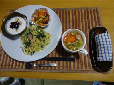 今日のメイン料理はパスタ、今が旬のかき菜を使った