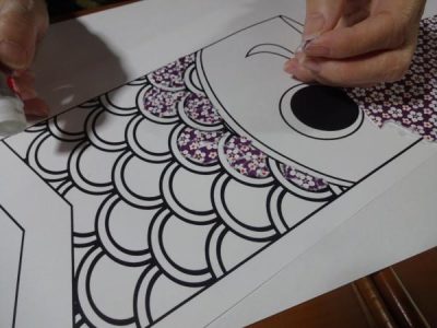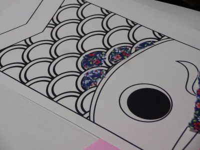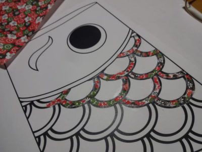 大きな鯉に好きな色の紙を貼っていきます