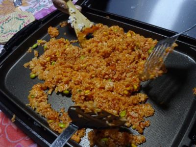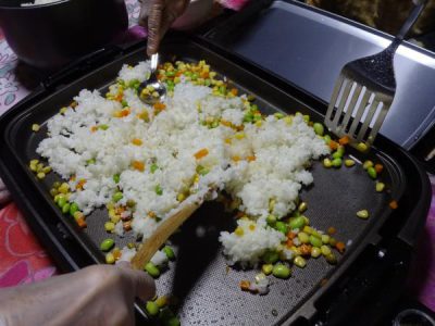 コーン・グリーンピース・人参・枝豆をいれてご飯とまぜます