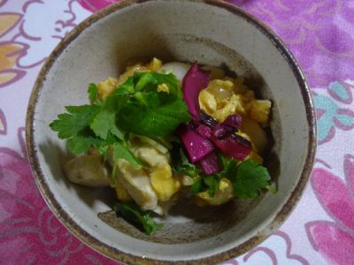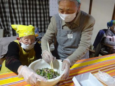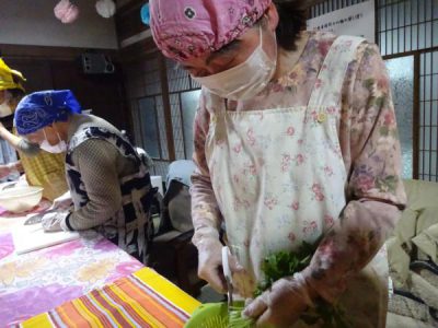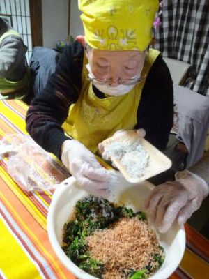 2人協力して 野菜を和えています