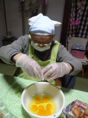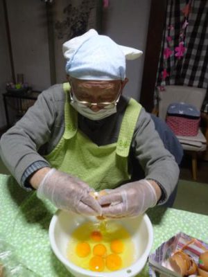 お父さん エプロン着けて 玉子を上手に割っています