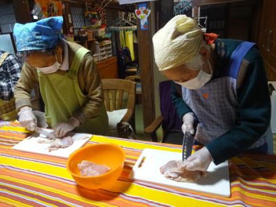 さっそく母達が協力をして、鶏肉を切っていきます