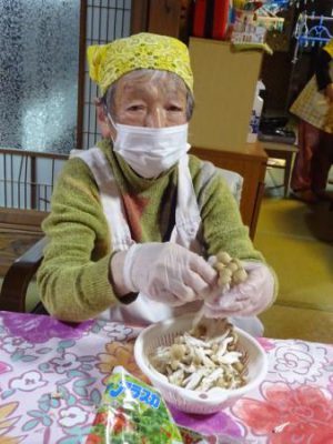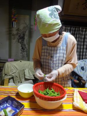 シメジを裂いたり、枝豆の中身を出したり と