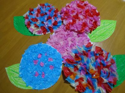 壁にあじさいの花で満開にしようと皆さんで頑張っています