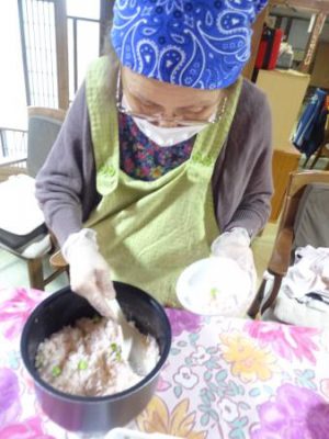 桜えびと一緒にご飯を炊き後から枝豆を加えていきます指でOK