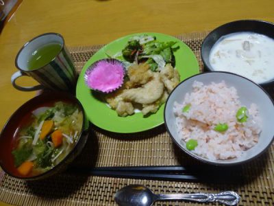 ほんのりピンク色になったご飯に枝豆の緑でとってもおいしそうひらめきひらめき