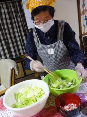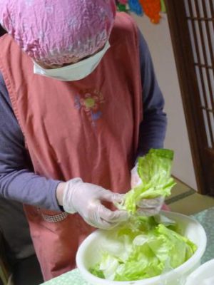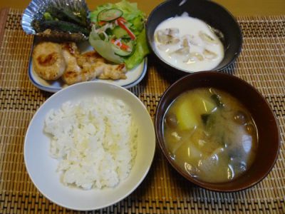 【しめじ・玉葱、ジャガイモ、油揚げ、ワカメ、レタス】