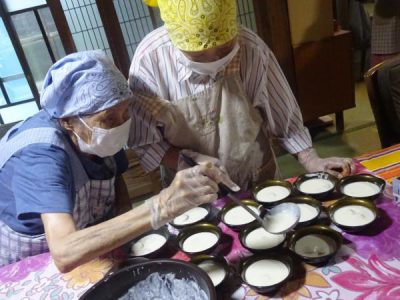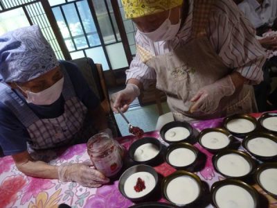 ヨーグルトを盛り付けて下さる母達